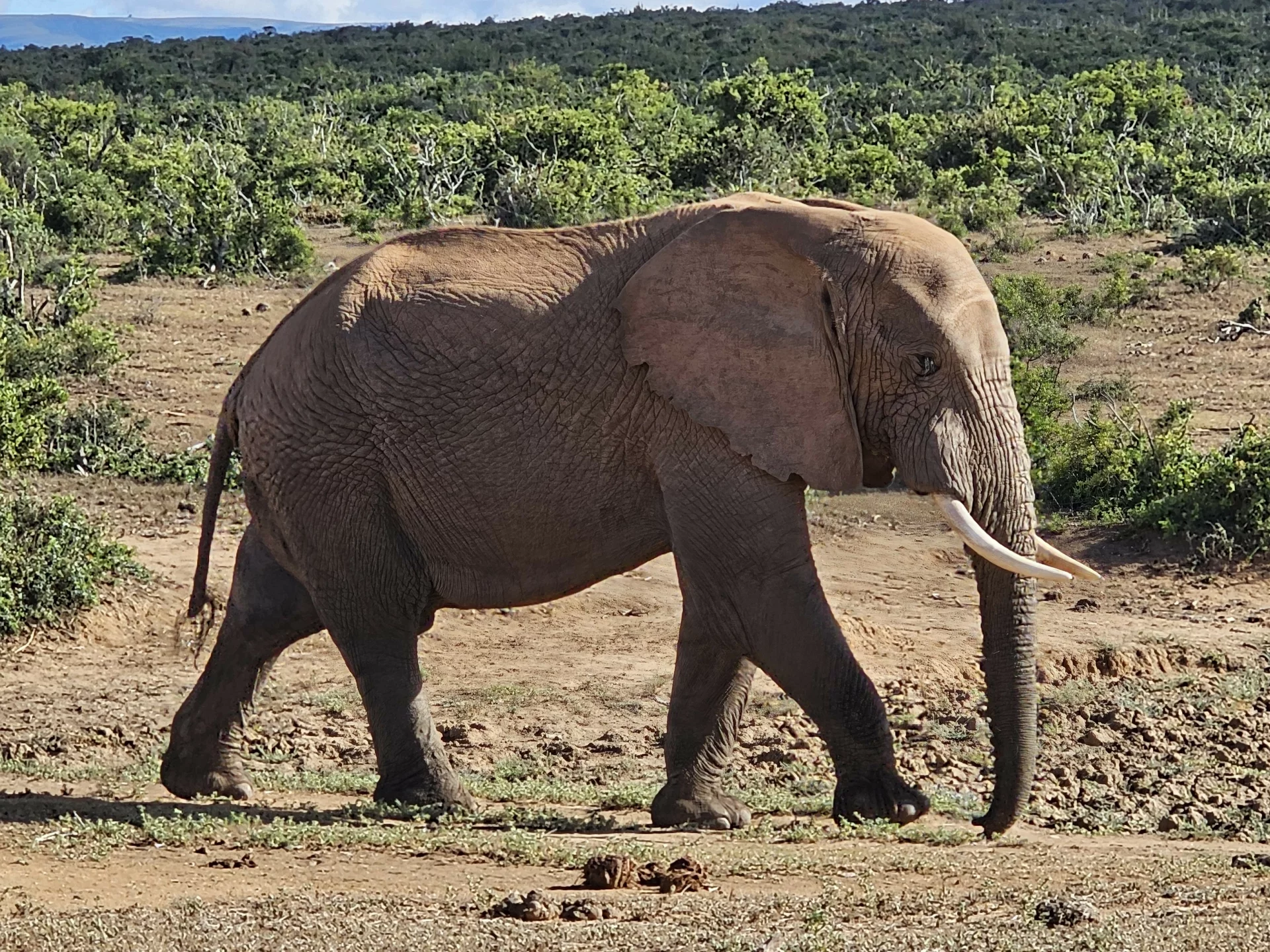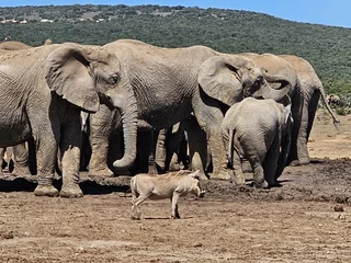 Die nächsten drei Tage verbringen wir im „Addo Elephant National Park“. Wir wohnen im Main Camp in komfortabel ausgestatteten Zelten. Es gibt einen gut sortierten Shop und ein Restaurant. Tagsüber sind wir ausgiebig im Park unterwegs und sehen trotz des recht dichten Buschwerks viele, viele Elefanten an den Wasserlöchern, entlang unserer Wege und manchmal auch direkt vor und neben uns auf der Straße. Auch das Camp hat ein Wasserloch, wo man auch noch abends Elefanten und Büffel beobachten kann. Viele tolle Tiererlebnisse …