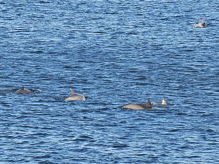 Vom „Shark Rock Pier“ aus sehen wir einige Delfin-Gruppen im Meer.
