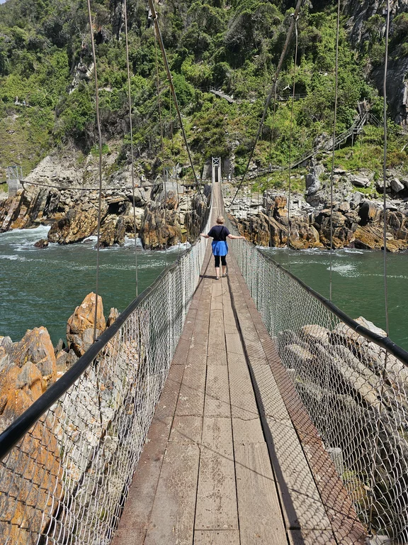 Am nächsten Morgen fahren wir dann bei leicht nebeligem und windigem Wetter zur hiesigen Sehenswürdigkeit, der „Suspension Bridge“ am „Storms River Mouth“. Dann kommt die Sonne wieder zum Vorschein und Uschi nimmt trotz Höhenangst all ihren Mut zusammen und geht mit uns auch über diese Hängebrücke.